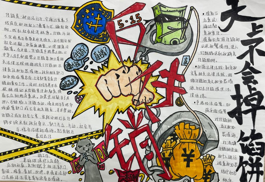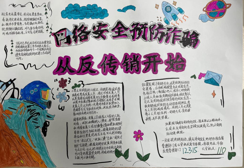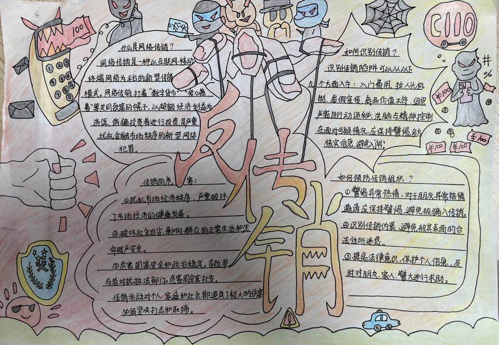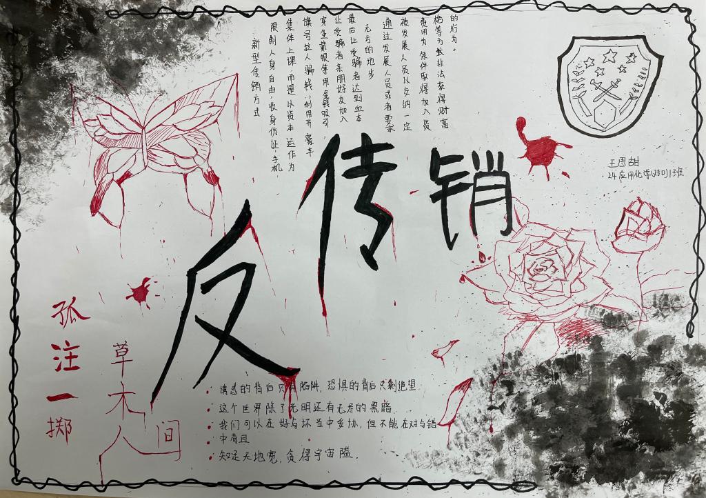 加强宣传教育,开展专题宣传。通过QQ 群,持续推送禁止传销宣传资料级宣传视频,并结合实际开展反诈手抄报宣传教育活动,同学们的手抄报作品内容丰富多彩、有声有色,既能展示当代大学生的多才多艺,又能将反诈知识潜移默化的深入人心。同时积极引导学生自我教育、自我管理、自我服务,将抵御传销融入校园文化,引导学生知法、懂法、守法,营造防范传销的浓厚氛围。