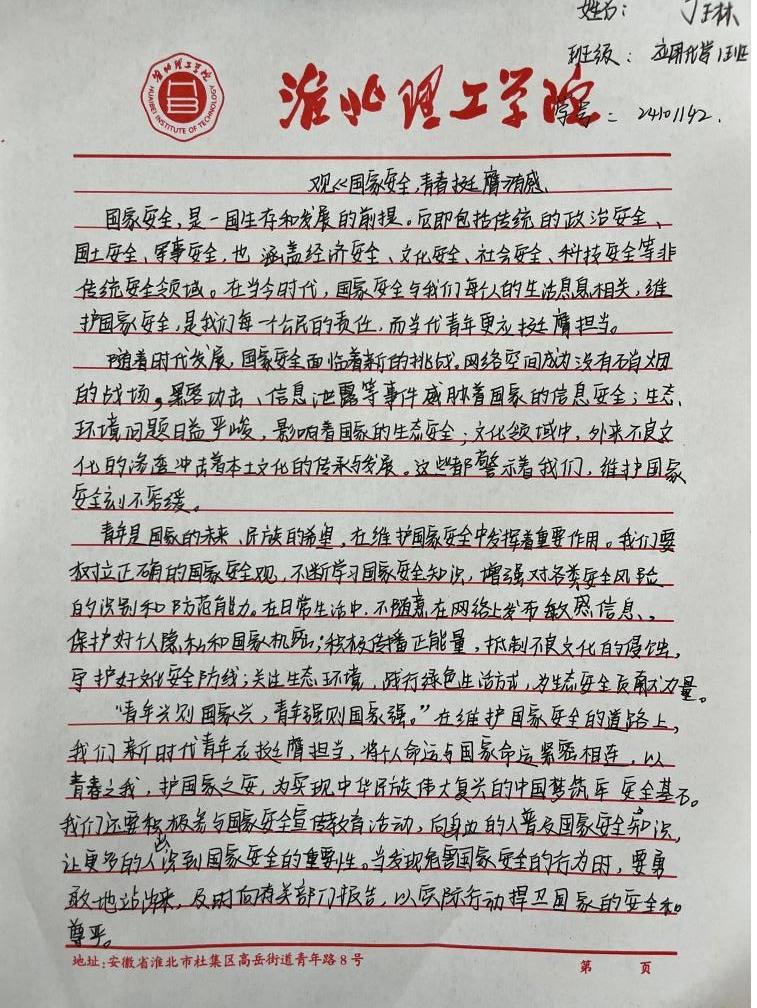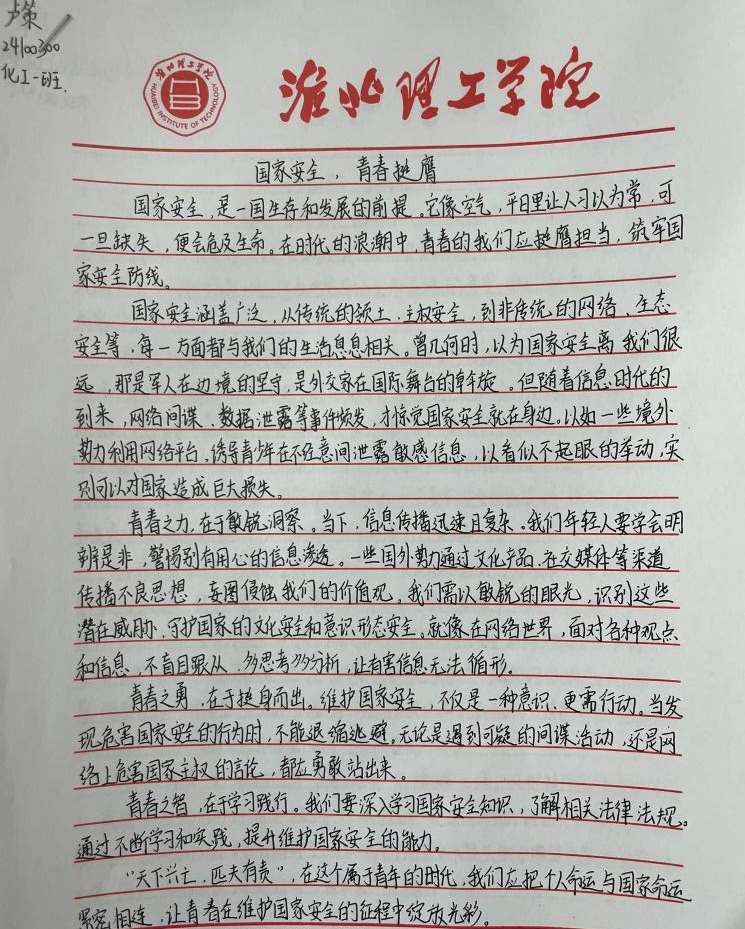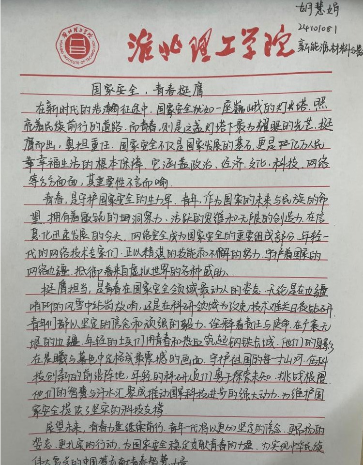 “国家安全,青春挺膺”感悟心得征集活动得到了同学们的积极响应,大家结合系列活动的参与体验,纷纷拿起笔,写下自己对国家安全的深刻感悟。有的同学在心得中写道:“国家安全是国家生存发展的基石,作为新时代青年,我们应立足专业,努力学习,为国家的文化安全和科技创新贡献力量。”还有的同学表示:“通过这次活动,我更加明白国家安全就在身边,我们要从点滴做起,自觉维护国家尊严和荣誉,以实际行动践行青春挺膺的誓言。”这些真挚的感悟,凝聚着同学们对国家安全的深刻理解和担当意识,也展现了yl6809永利官网青年学子积极向上的精神风貌。