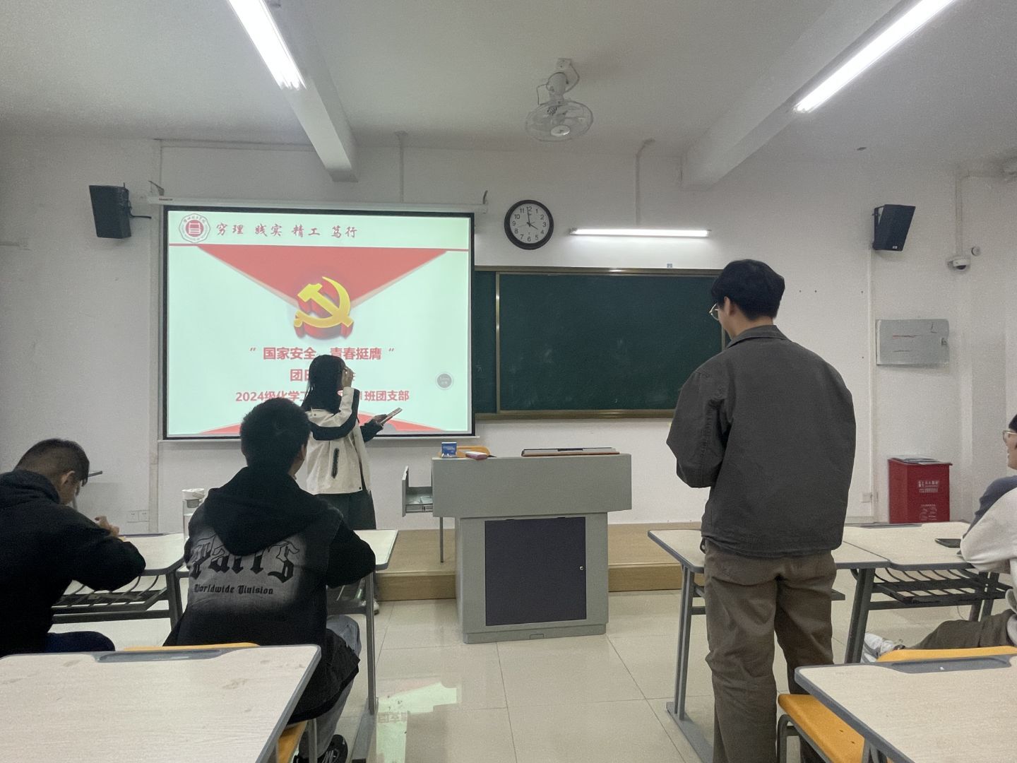 “全民国家安全教育,走深走实十周年”团课作为此次系列活动的开篇,各团支部书记担任主讲人,深入解读国家安全的内涵与外延。从传统的政治安全、国土安全,到非传统的网络安全、生态安全、能源安全等领域,结合当下国内外形势,通过生动案例和数据,让同学们深刻认识到国家安全与每个人息息相关。在互动环节,同学们踊跃提问,就如何在日常生活中维护国家安全展开热烈讨论,进一步加深了对国家安全重要性的理解,为后续活动的开展筑牢了坚实的思想根基。