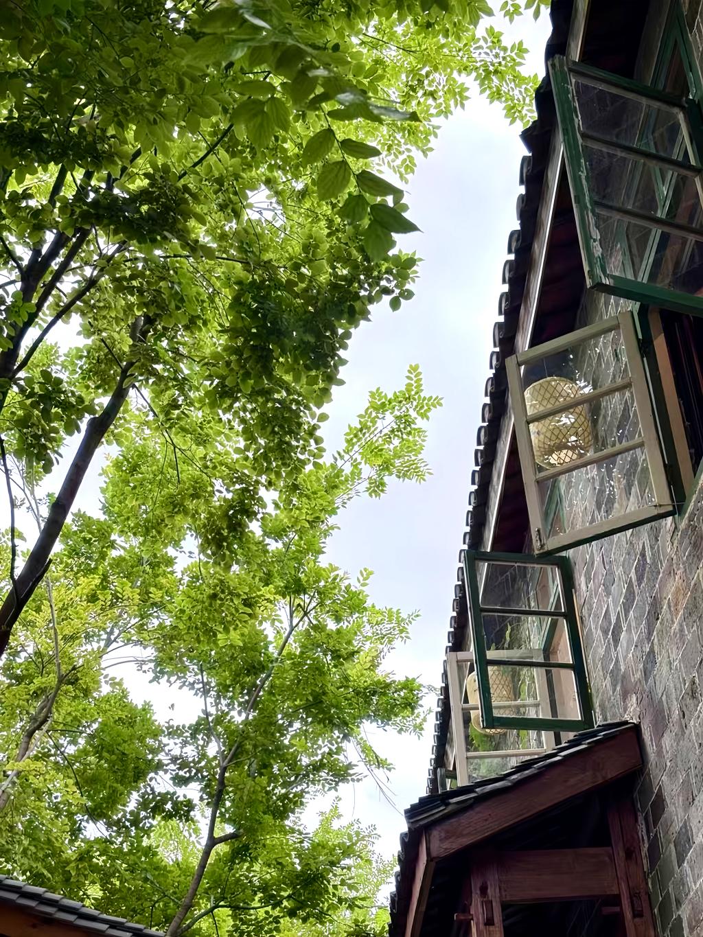 这张图片展现了古朴建筑与繁茂绿树相映成趣的景致。石砌墙体搭配木质结构,窗户半敞,绿树枝叶葱茏,充满自然与古韵交融之美。(2024级化学工程与工艺1班 温馨)
