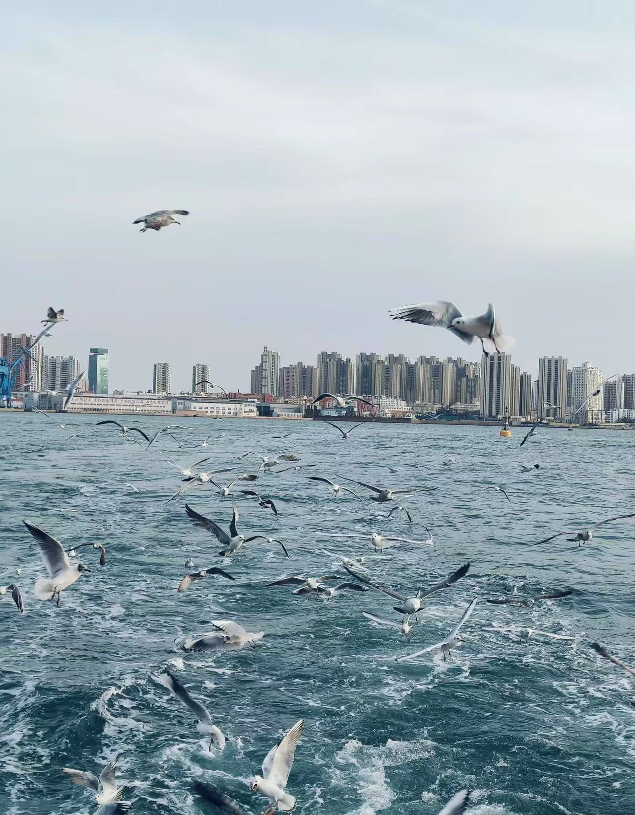 图中展现海面群鸥飞舞的场景,海鸥姿态各异,背景是错落的城市高楼,洋溢着自然与都市交融的活力。(2024级应用化学(对口)1班 姚蒙)