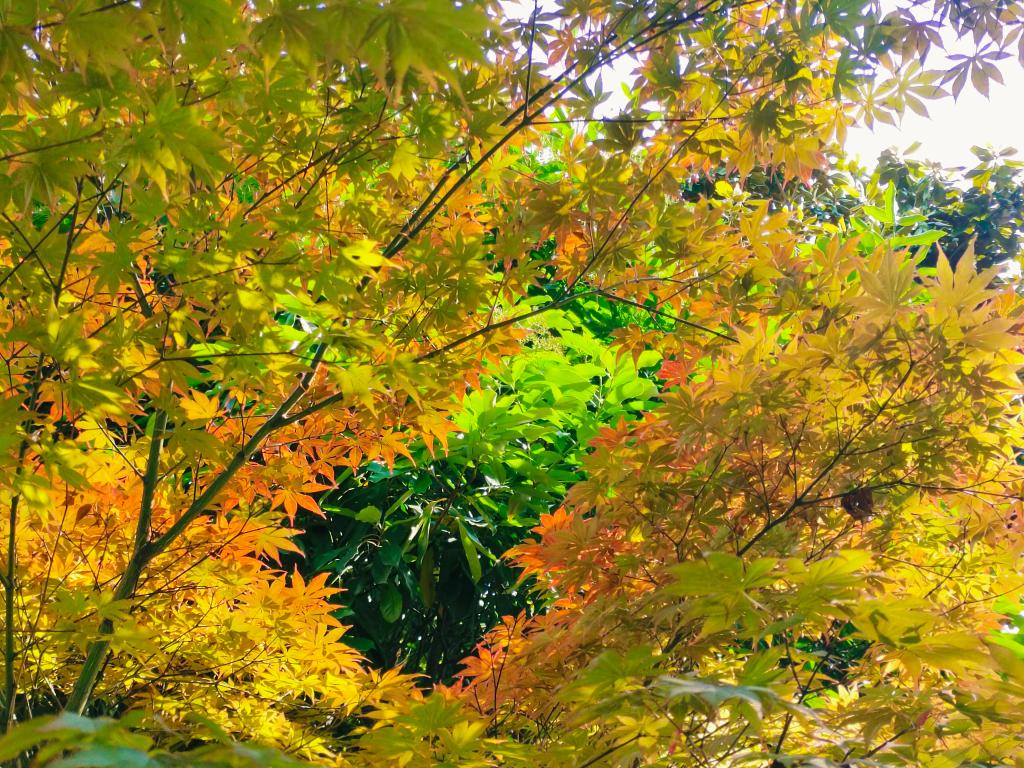 画面中呈现枝叶繁茂的林木,叶片黄橙交织色彩,阳光洒落,光芒透过斑斓树叶,营造出温暖的林间光影效果。(2024级应用化学(对口)1班 韩杰)