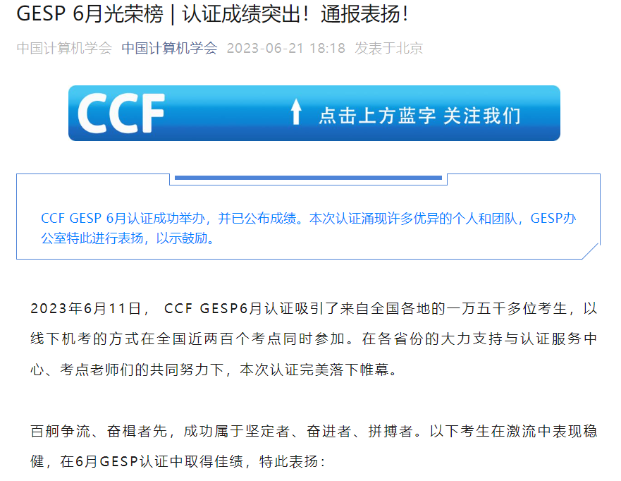 本网讯 近日,中国计算机学会官方公众号报道了GESP 6月认证情况,ac米兰官网作为优秀考点之一上榜。本次认证考试于6月11日举行,来自全省各地的近500名中小学考生参加考试,ac米兰官网中文网站经过认真筹备、周密部署、规范考务,圆满完成了本次认证考试任务。