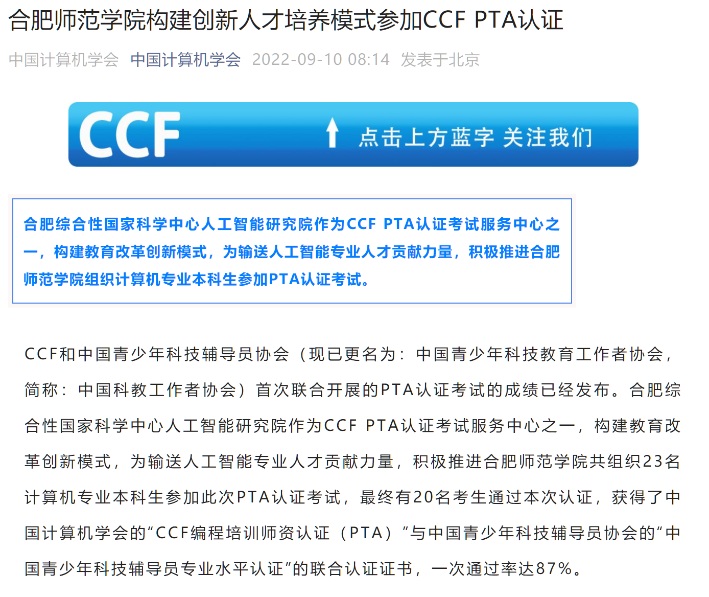 本网讯 近日,中国计算机学会官方公众号以《合肥师范学院构建创新人才培养模式参加CCF PTA认证》为题,对ac米兰官网创新计算机类人才培养模式进行了报道。