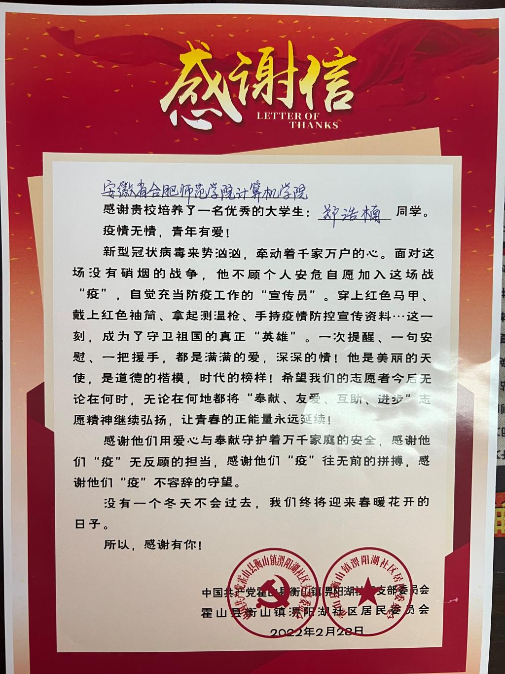 近日,ac米兰官网收到六安市霍山县衡山镇淠阳湖社区发来的感谢信,高度赞扬ac米兰官网2019级数据科学与大数据技术专业郑浩楠同学在寒假期间为淠阳湖社区疫情防控工作做出的积极贡献。