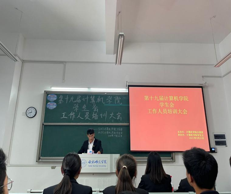 为进一步加强计算机学院学生会组织建设、推动学生会工作人员作风建设、鼓励学生会工作人员在工作中起到先锋模范的作用,9月25日下午两点,计算机学院在滨湖校区博学楼A104召开第十九届计算机学院学生会工作人员培训大会,全体学生会成员出席。