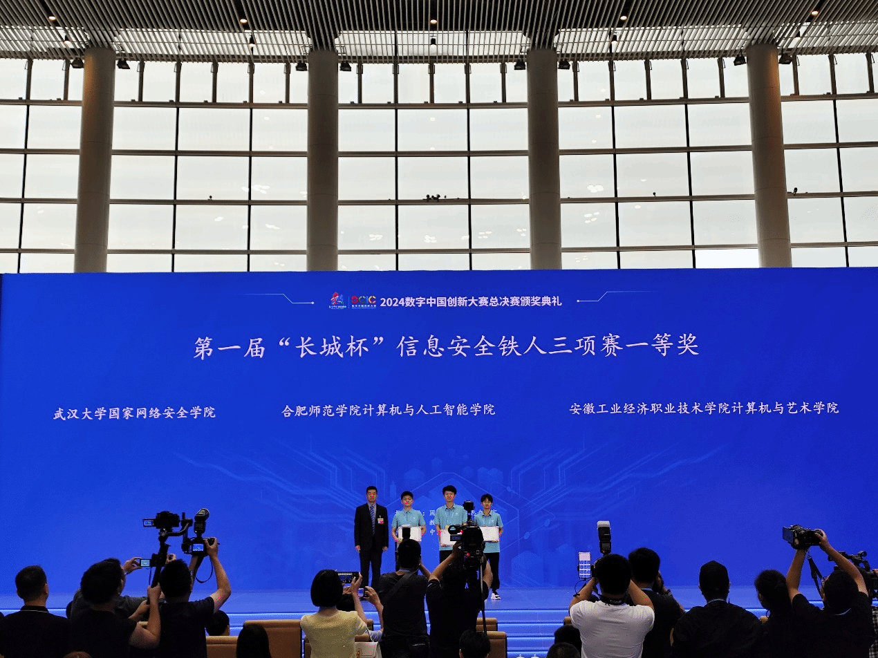 第七届数字中国建设峰会5月24日在福建省福州市开幕,中共中央政治局常委、国务院副总理丁薛祥出席开幕式并发表主旨讲话。作为数字中国建设峰会的重要赛事,第一届“长城杯”信息安全铁人三项赛决赛得到国家数据局、福州市委、市政府的大力支持,在峰会期间成功举办。本次大赛以“网络智能防御,开启数字安全新时代”为主题,旨在打造高校网络安全权威赛事,聚焦培养卓越网络安全专业人才,促进网络安全产业持续发展。大赛展现了一场智力与技术的巅峰对决,来自86所高校400余名师生会师决赛。合肥师范学院ac米兰官网中文网站代表队经过初赛和半决赛的层层筛选,参加了本次总决赛。