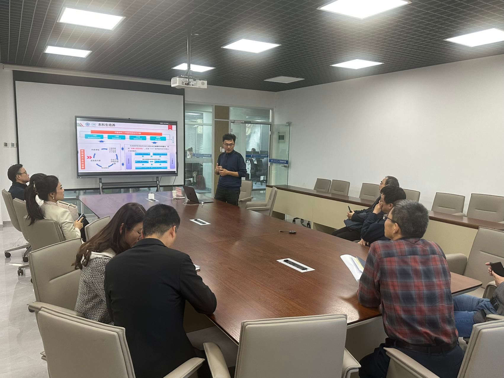 苏喻就“如何打造本科人才培养校院合作方案”进行了全方面的汇报,从本科一年级至本科毕业,基地形成了全流程体系化的培养方案。在学校内,由拥有多年经验的大厂工程师入校为学生授课课程与毕业设计指导;在学校外,由合肥综合性国家科学中心人工智能研究院为本科生提供实践平台,打造产学研一体化的能力培养路线,培养高素质应用型人才。目前,基地已联合培养50余名本科学生,毕业生就业率100%,平均工资提升20%以上的好成绩!