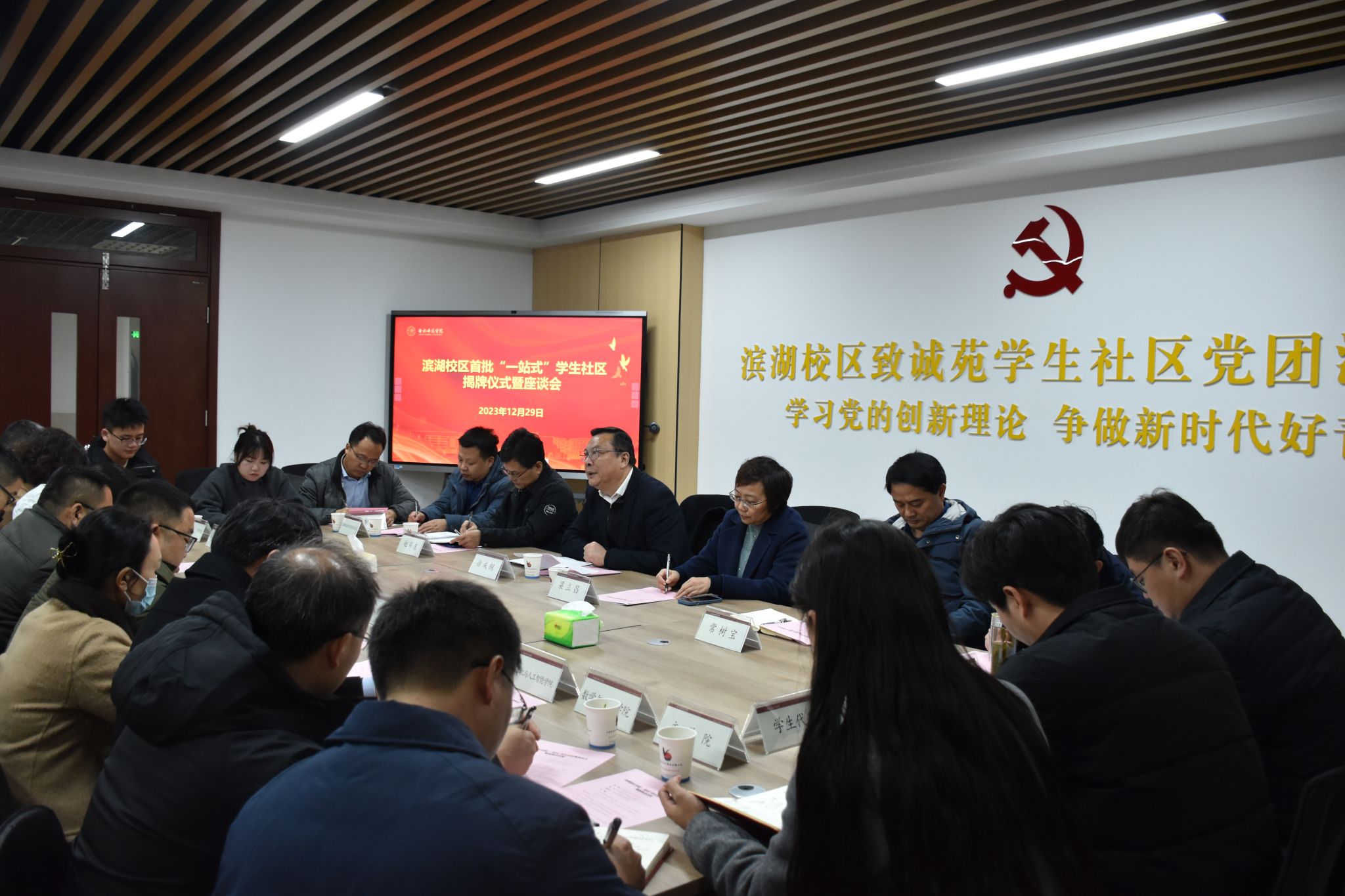 本网讯 2023年12月29日上午,学院滨湖校区首批“一站式”学生社区揭牌仪式暨座谈会在滨湖校区1号学生公寓“一站式”学生社区举行。院党委书记徐成钢,院党委副书记梁立昌,院党委委员、组织部部长赵帮恚,院党委委员、宣传部部长常树宝出席会议并为滨湖校区首批“一站式”学生社区揭牌。教务处、后勤处、滨湖校区综合管理办公室、学生工作部、团委等单位负责人,各二级学院有关负责人、辅导员和学生代表参加会议。会议由梁立昌主持。