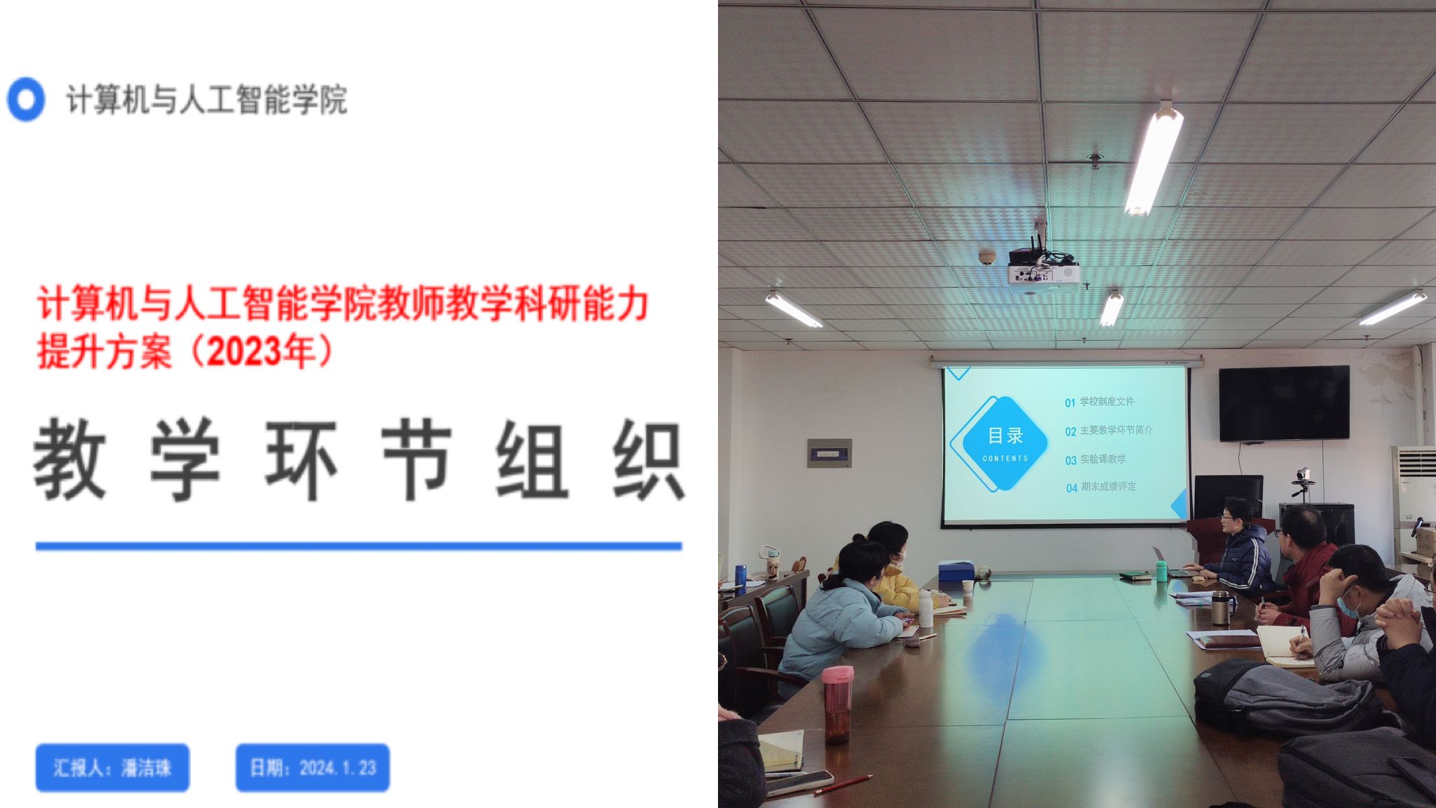 2024年1月24日,开展教学科研能力提升第四阶段系列活动,潘洁珠老师为大家做了题为《教学环节组织》的报告。潘老师首先带领大家学习了学校的制度文件;然后进行了教学各个环节的内容、要求及评价标准介绍,最后分享了《数据库原理及应用》课程组在加强实践教学、加强过程性考核的具体举措。